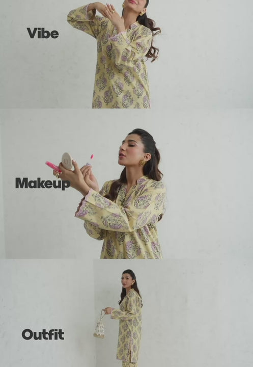 With a soft light yellow base, this ensemble radiates warmth and finesse. The shirt is adorned with a seamless motif print, while the trousers feature a distinct yet coordinated design — creating a balanced, fashion-forward look perfect for sunny afternoons.