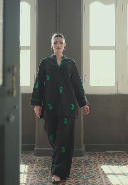 This black ensemble redefines minimalism with subtle brilliance. The shirt features a contrasting motif in clean lines, while the sleek black trousers add a structured touch — a refined look for modern-day elegance.