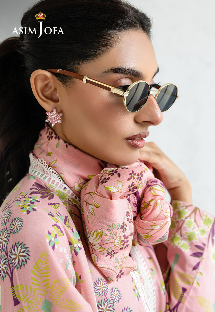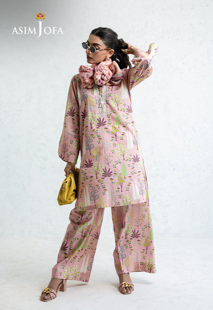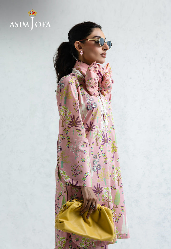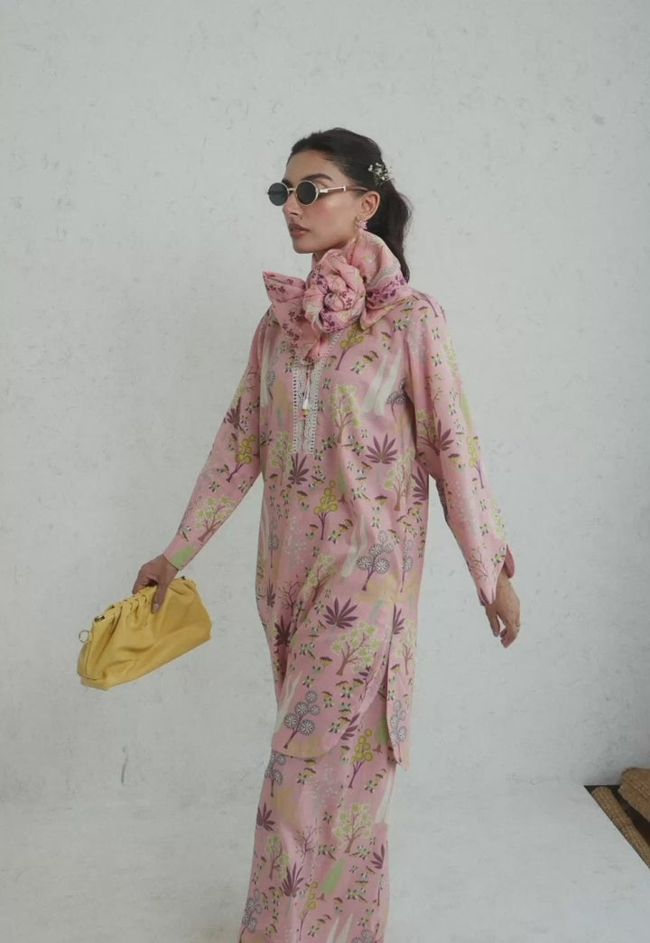 Feminine and fresh, this pink ensemble brings a garden to life. The shirt features delicate floral and botanical prints with lace detailing at the neckline, paired with coordinating printed trousers and a printed dupatta, perfect for adding charm to any sunny outing.