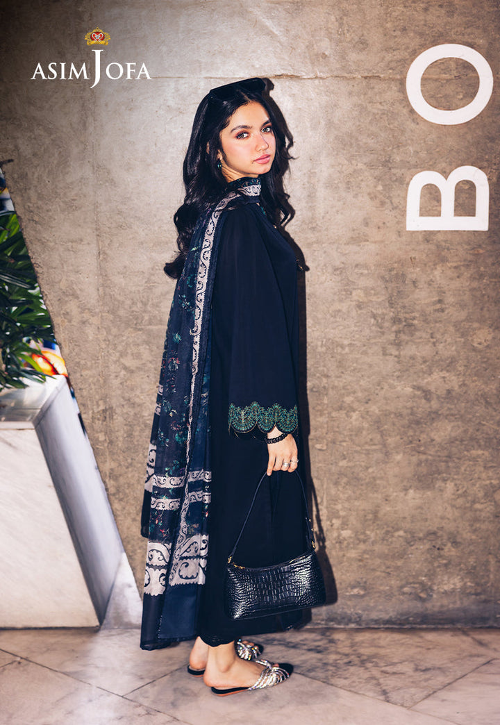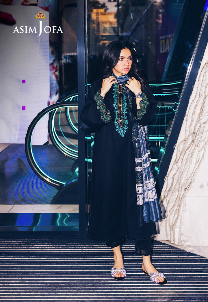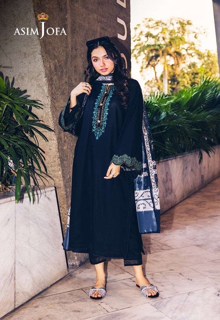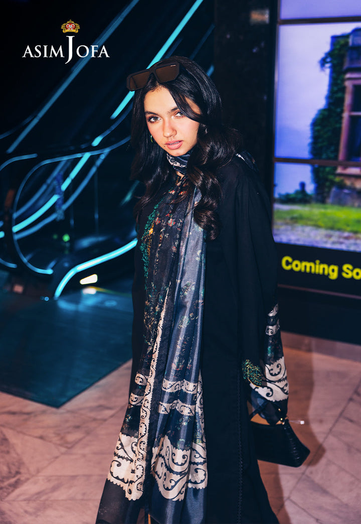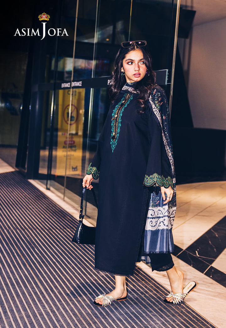 The allure of the night is woven into the very fabric of this cambric outfit from Asim Jofa’s “Essential Pret” Collection. The cationic chiffon dupatta flows like a gentle breeze against the backdrop of an endless evening. Aina Asif wears this set as design that exudes confidence and grace with every step.