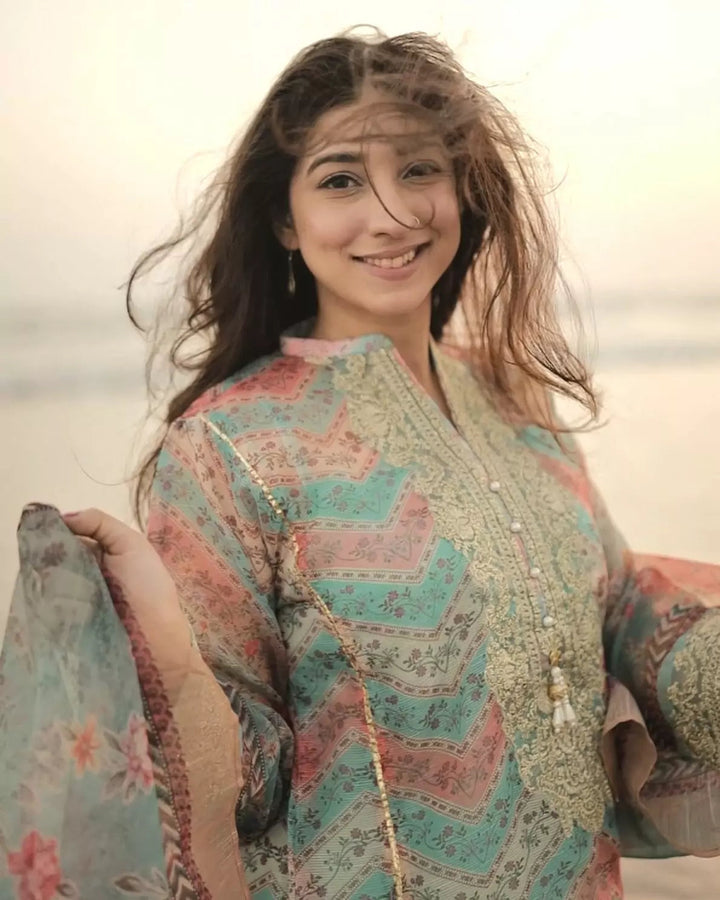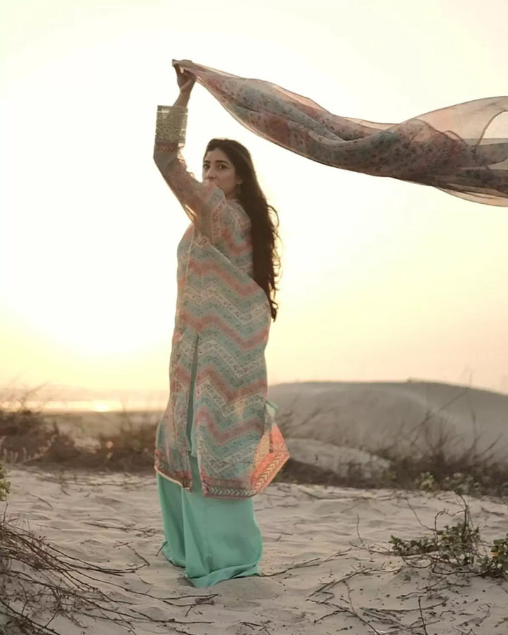 Aquamarine luxury article features a printed organza shirt with gold embroidery and fancy button details. These are finished with a flared trouser.
