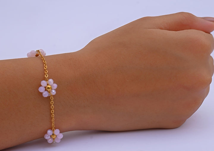 A blooming floral chain bracelet/necklace in soft, versatile colors. Made from stainless steel with a gold finish — it’s water-resistant, tarnish-free, and perfect for everyday wear.