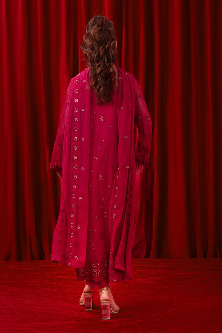 "Top: Magenta Pink Chiffon Kurta with Hand Adda Work, Sequence Embroidery and Malai Crepe Inner