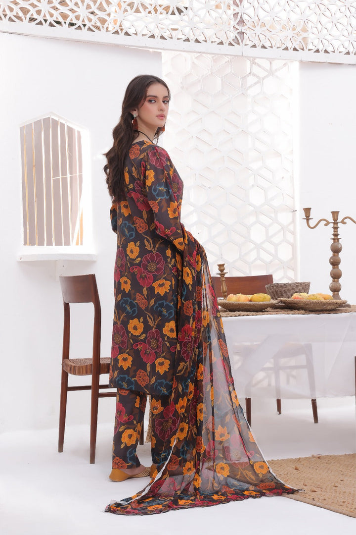 The article includes:Unstitched 3PCDigital Printed Shirt 3 yardsDigital Printed Chiffon Dupatta Digital Printed Trouser 2.5 yards