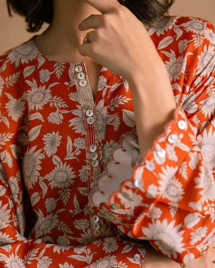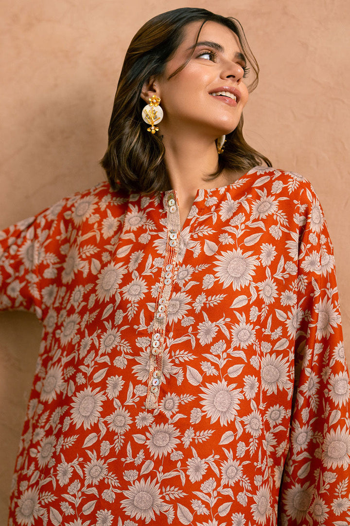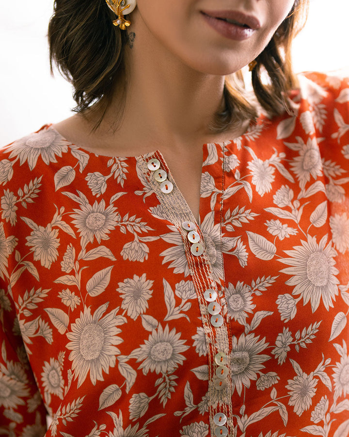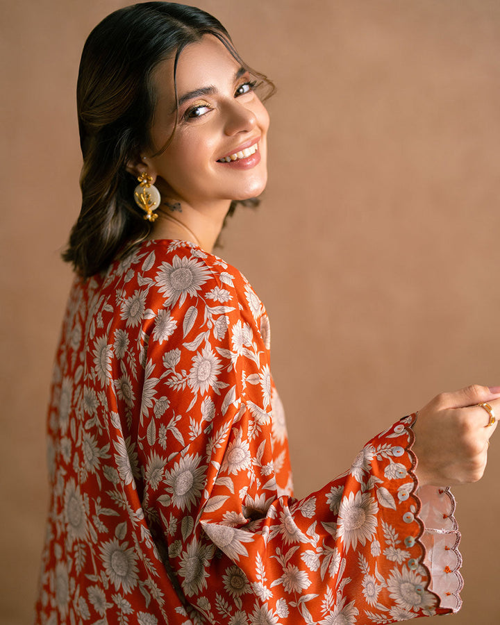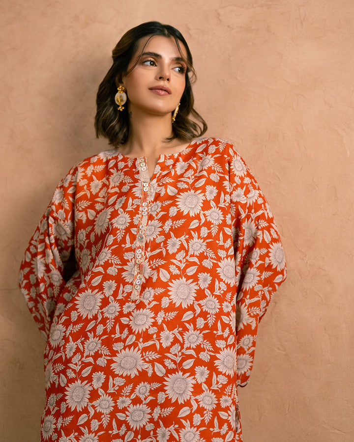 Embrace effortless style with our drop shoulder kameez in vivid Orange, adorned with digital prints of beautiful flowers.