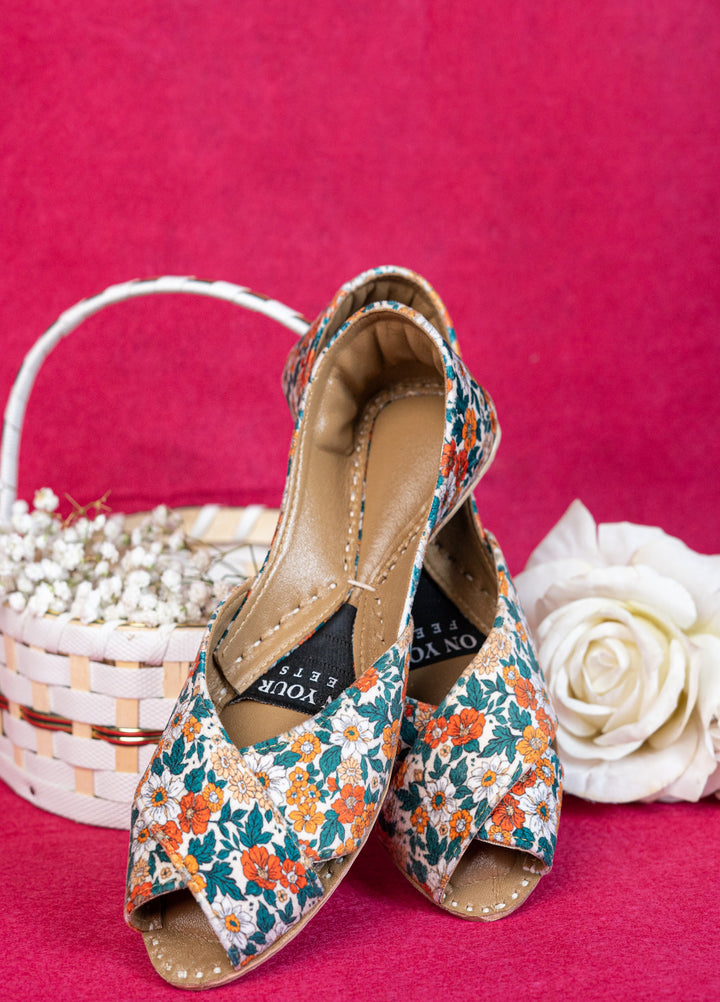 Embrace elegance and comfort with the Floral Bliss Printed Peshawari Khussa, a perfect blend of tradition and modern fashion. Featuring a delicate off-white base adorned with vibrant orange and green floral prints, this handcrafted khussa adds a fresh and stylish touch to any outfit. The crisscross peep-toe design enhances breathability and comfort, making it ideal for casual outings, festive celebrations, or summer gatherings. Crafted with a cushioned insole and fine stitching, this khussa pairs beautifully with ethnic wear as well as contemporary ensembles for a chic, effortless look