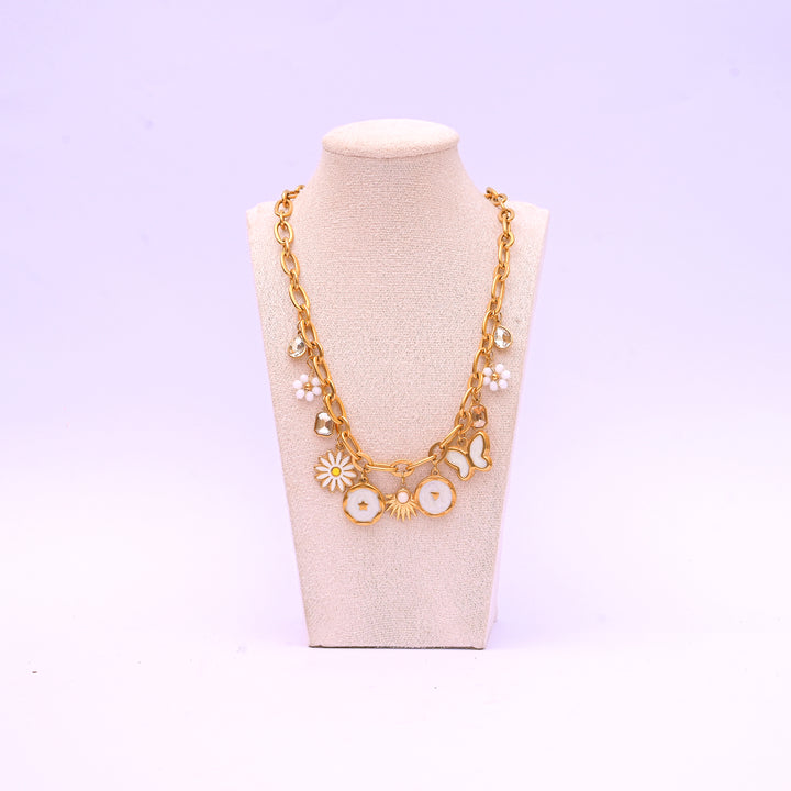This charm necklace dazzles with 11 gold and white enamel charms including four crystal drops and two beaded floral charms, all linked on a sturdy rolo chain. Stainless steel for durability and style.