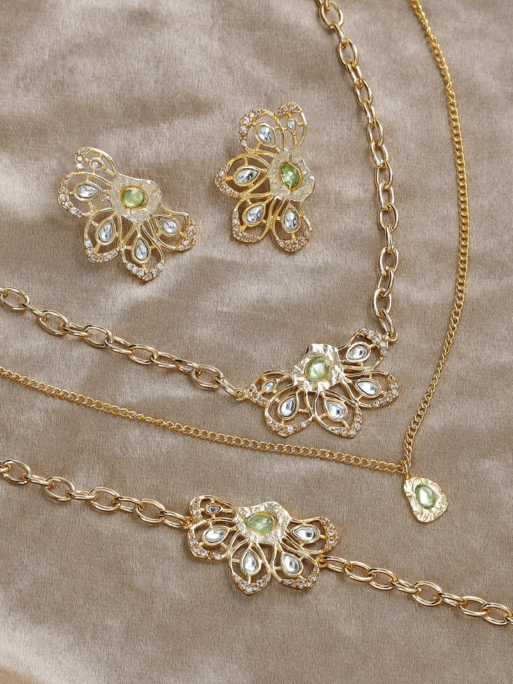 The Gulbahar chain bracelet features a delicate floral design with natural peridot stones, set in antique-textured metal. Adorned with zircon and kundan accents, this elegant piece blends vintage charm with vibrant color, adding a touch of sophistication to any wrist.