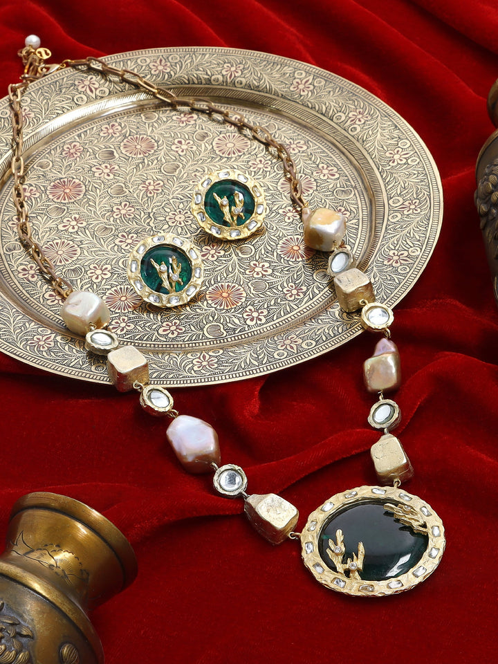 The Hurrem studs feature a striking cabochon green stone set in textured metal with an antique finish, enhanced by sparkling zircon accents. This elegant design combines vintage charm with a modern touch, making it a sophisticated addition to any jewelry collection.