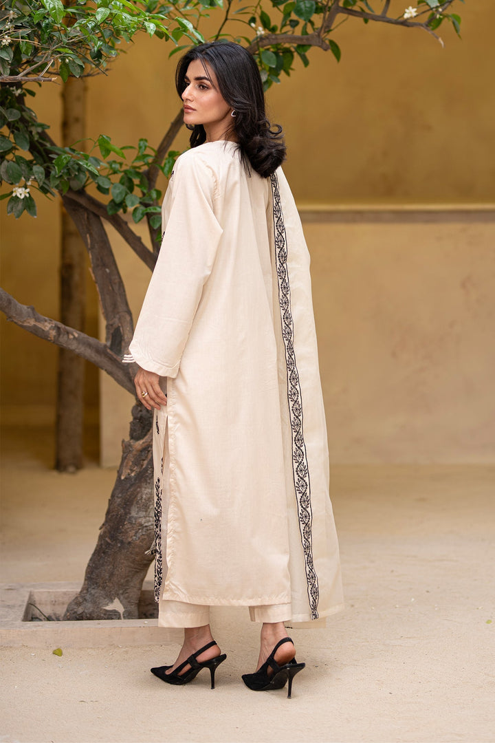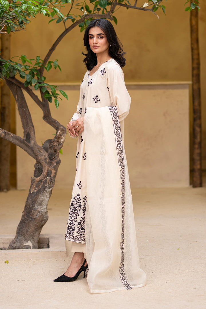 Product Details: Inara – An off-white canvas adorned with black motifs, paired with cotton trousers and a breezy cotton net dupatta for a timeless contrast.