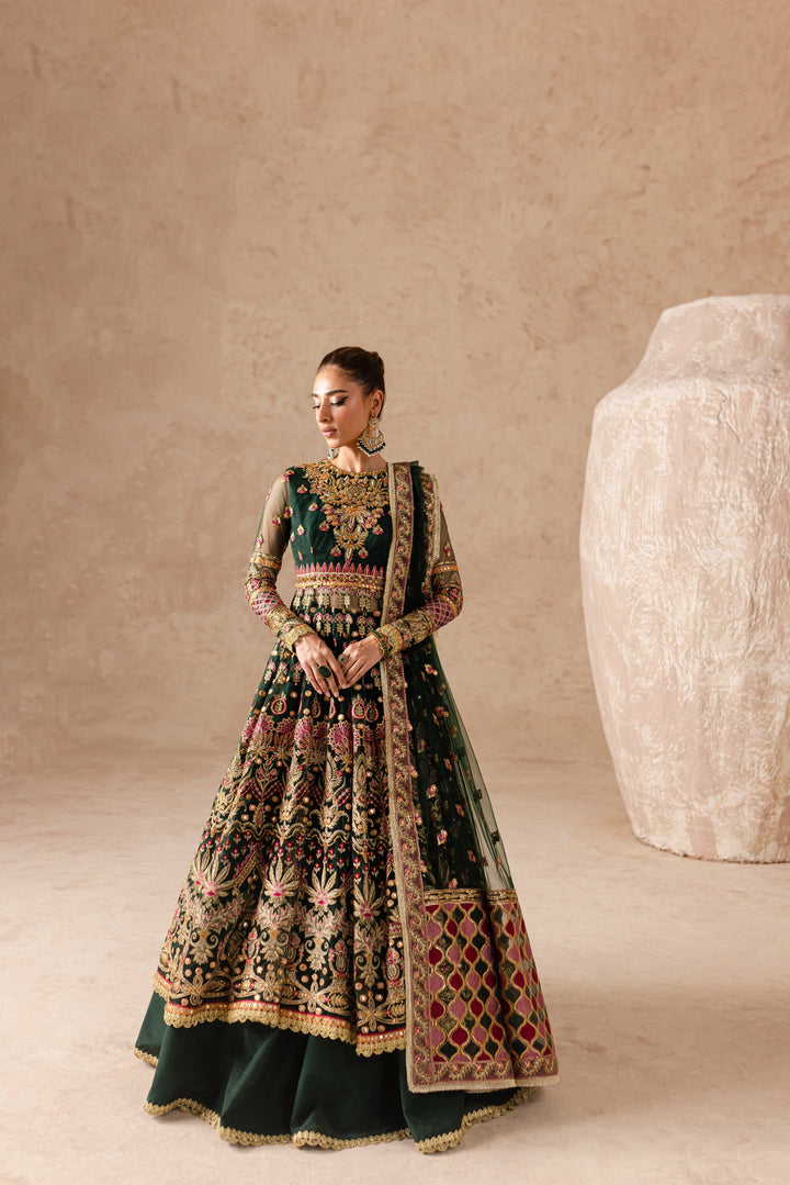 This luxury dress is a true work of art, hand-embellished with intricate Dabka and Naqshi work. Delicate Kashti and Bethki work add texture, while Pearls and shimmering Kanch Moti lend an air of elegance. Sparkling Sitara and Cutt Dana accents enhance its beauty, finished with graceful Surahi hand-work for a touch of sophistication.