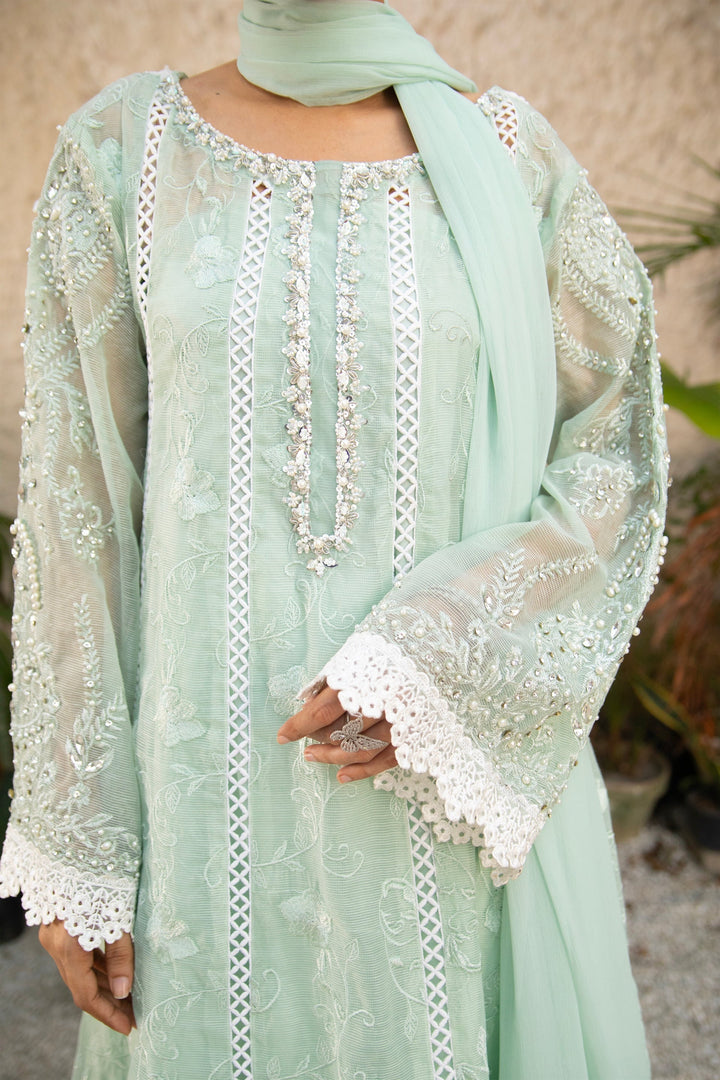 - Additional Description: This embroidered dress crafted from Khaddi net fabric is a perfect fusion of traditional elegance and modern flair. The soft, breathable fabric provides comfort, while the intricate embroidery adds a rich, artistic touch, creating a striking visual appeal. The beautiful panel lace design enhances the flow of the dress, offering a delicate and refined look with every movement. The standout feature is the handwork on the neckline, where each detail is thoughtfully crafted, upgrading the dress with an extra layer of craftsmanship and sophistication. This dress combines heritage and luxury in one stunning piece. Note: Measurements very according to designs. Colors may appear slightly different. trouser patches change in every dress. Remember: Dry Clean Only.