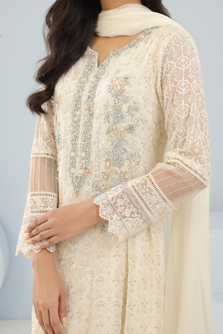 A flattering fit - This fully embroidered chiffon frock is as graceful as it can get. Its gorgeous V-style neckline & bodice are fashioned with intricate hand work of kora dabka and other embellishments. The sleeves and damann are finished with a beautiful lace design, detailed to perfection.