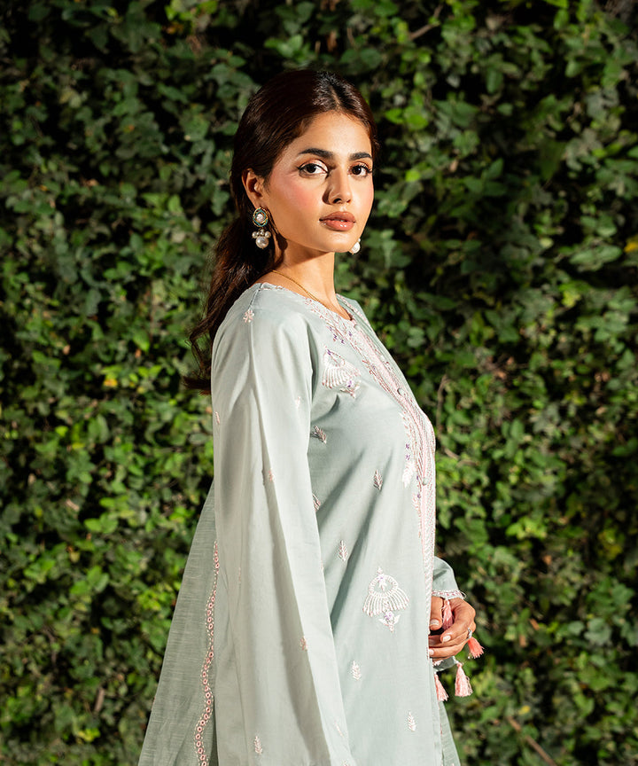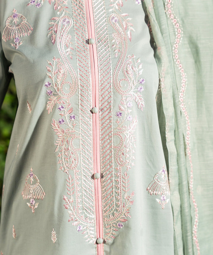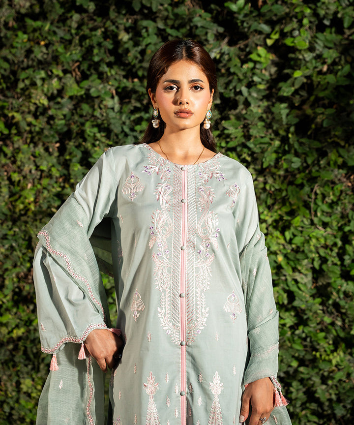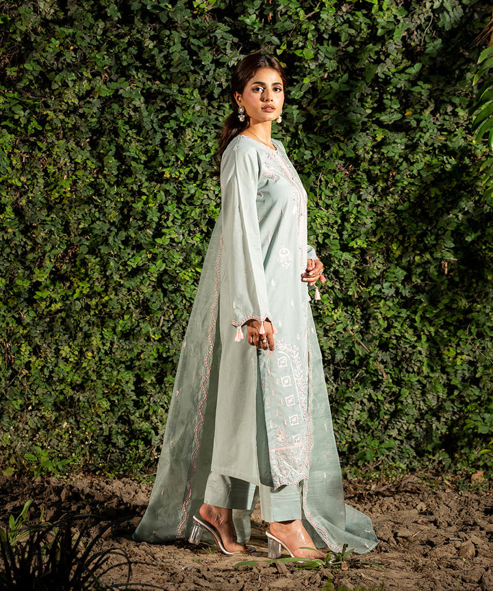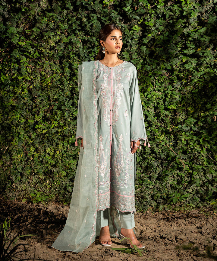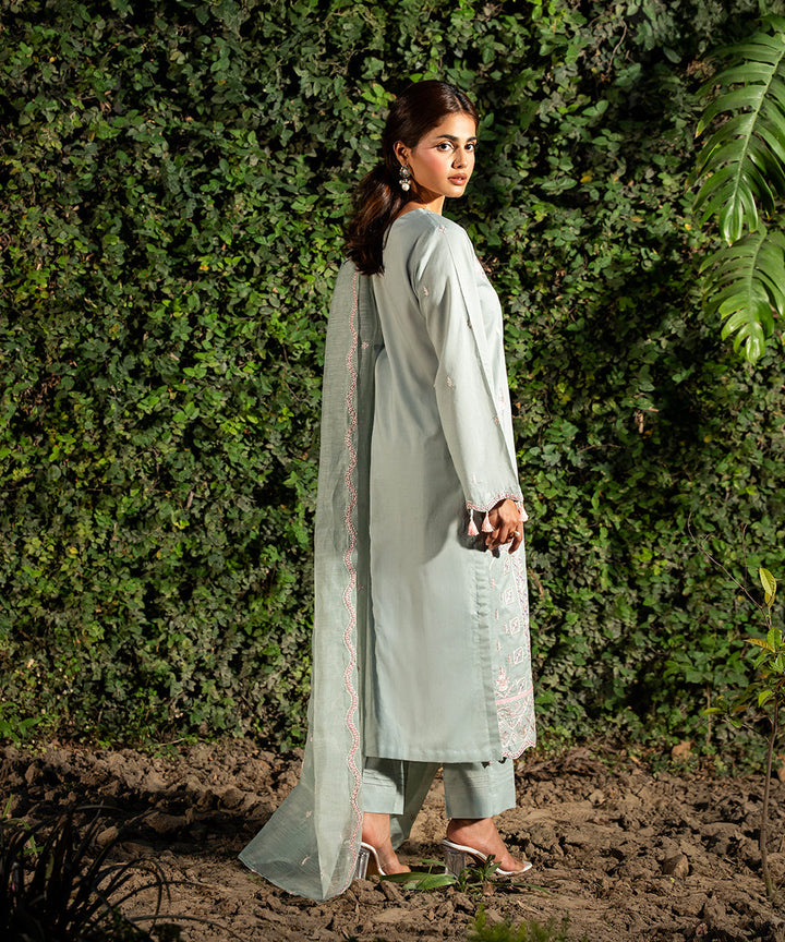 Description: This stitched 3-piece lawn suit in a serene sky blue shade features intricate embroidery on the shirt with delicate detailing. It is paired with a classic straight-cut trouser for a polished look and a lightweight Monar dupatta that adds a graceful, flowy finish, perfect for elegant daytime or semi-formal occasions.