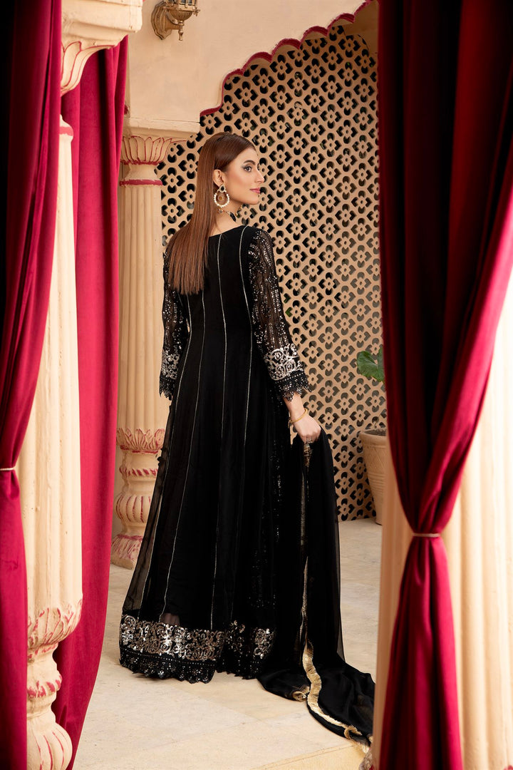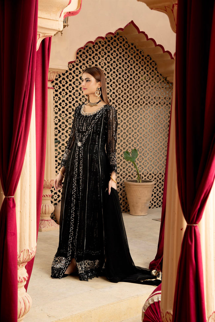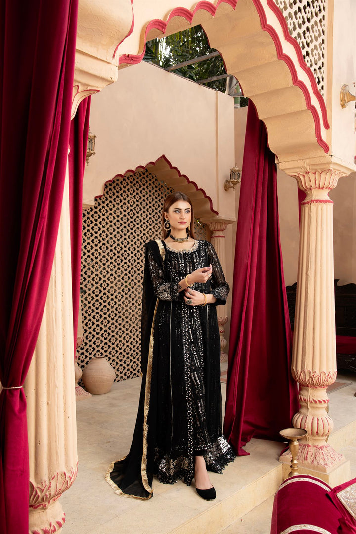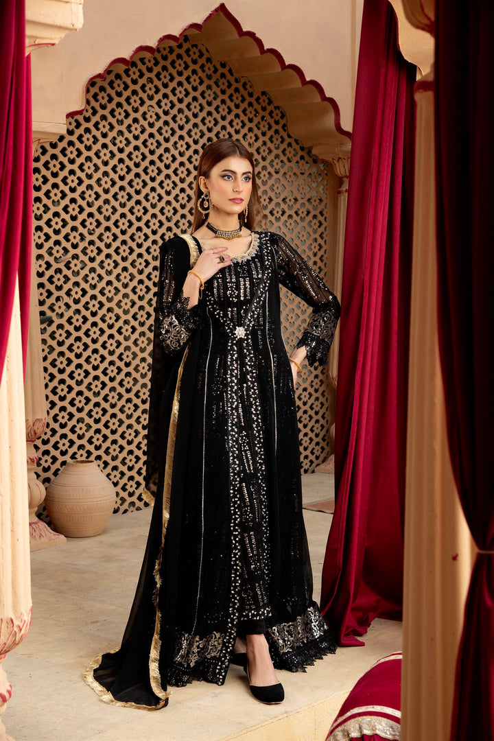 There is exquisite embroidery work in vertical patterns, which exudes grace and elegance, is a marvel of craftsmanship and design. The designer's exquisite use of the sitara, stone work and sequin embroidery technique enhances this lovely dress. A gorgeous chiffon dupatta with a kiran lace border completes the ensemble. Make use of Mona Embroidery to showcase your individual style and embrace it.