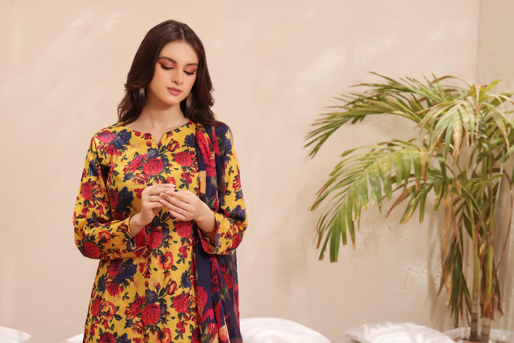 The article includes:Unstitched 3PCDigital Printed Shirt 3 yardsDigital Printed Chiffon Dupatta Digital Printed Trouser 2.5 yards