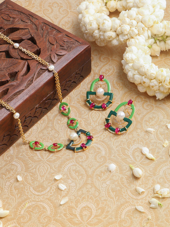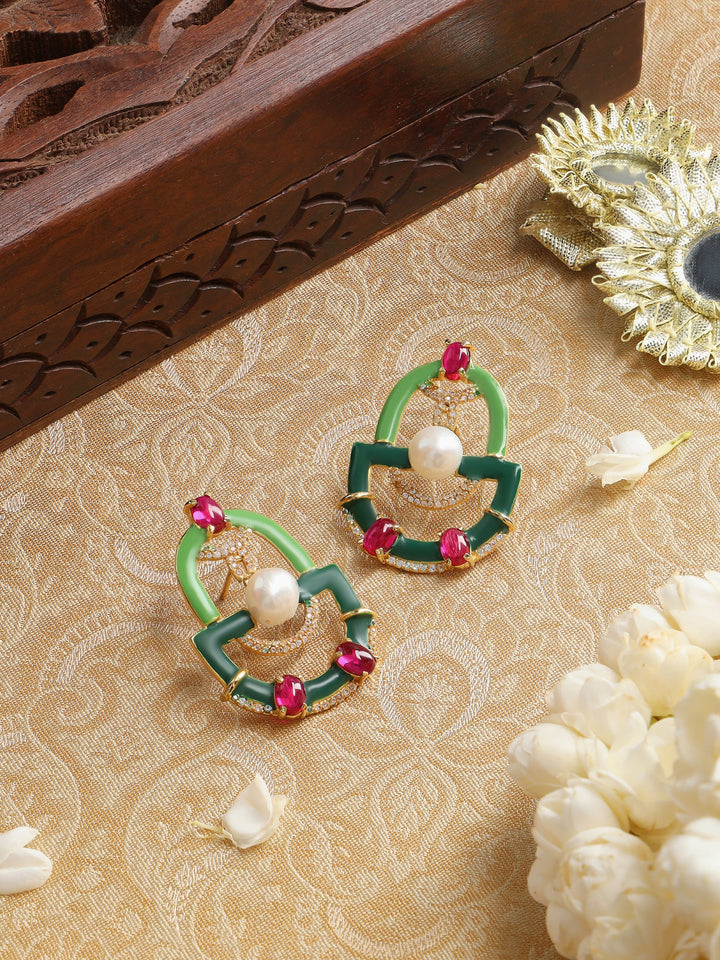 Crafted with 21K gold plating and mixed metals, these earrings feature real freshwater potato pearls, zircons, and cabochon stones. Handpainted with intricate designs, they offer a unique, artisanal touch.