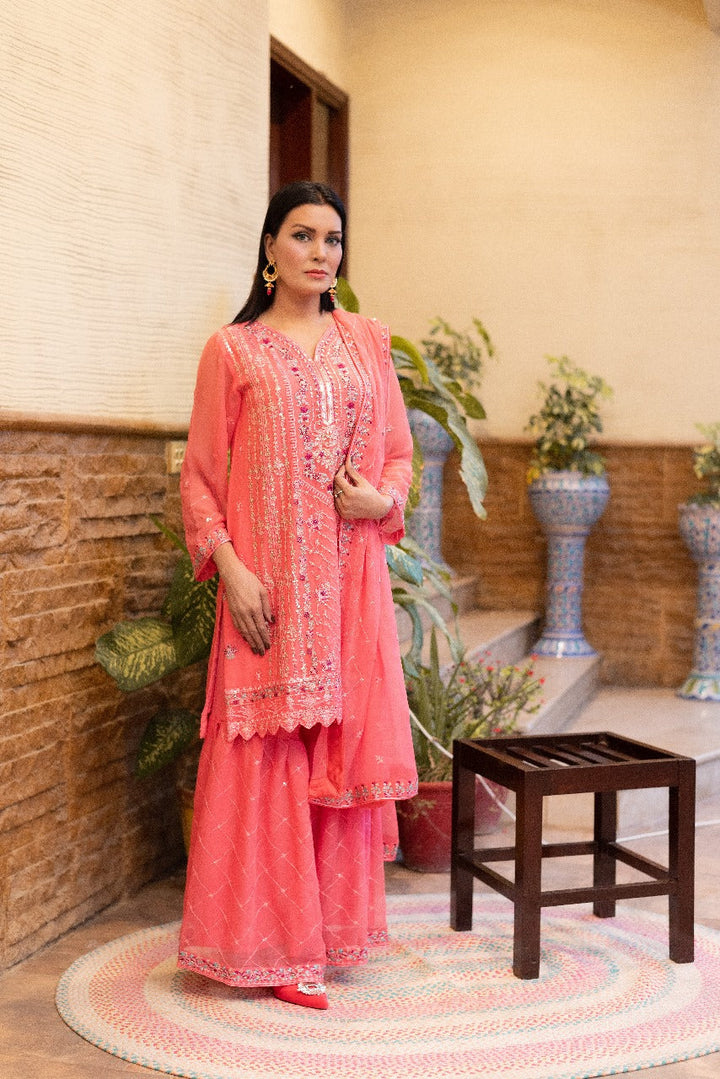The Melon Pink Chiffon Gharara 3-Piece Outfit** is a stunning and elegant ensemble, perfect for special occasions like weddings, receptions, or festive celebrations.?