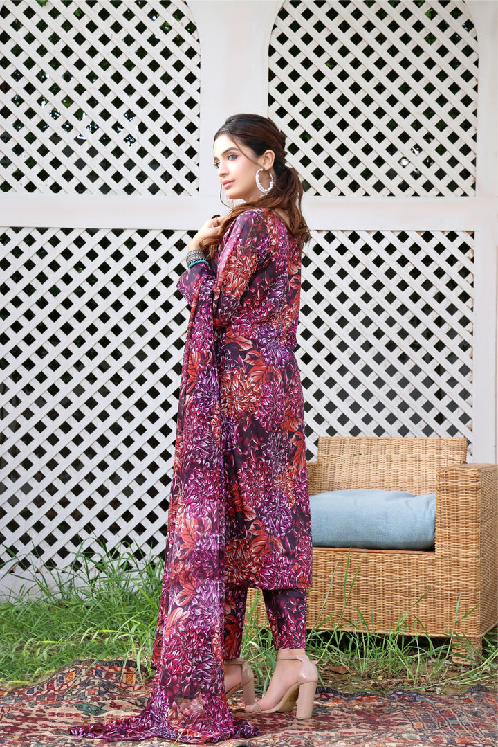 The article includes:Unstitched 3PCDigital Printed Shirt 3 yardsDigital Printed Chiffon Dupatta Digital Printed Trouser 2.5 yards
