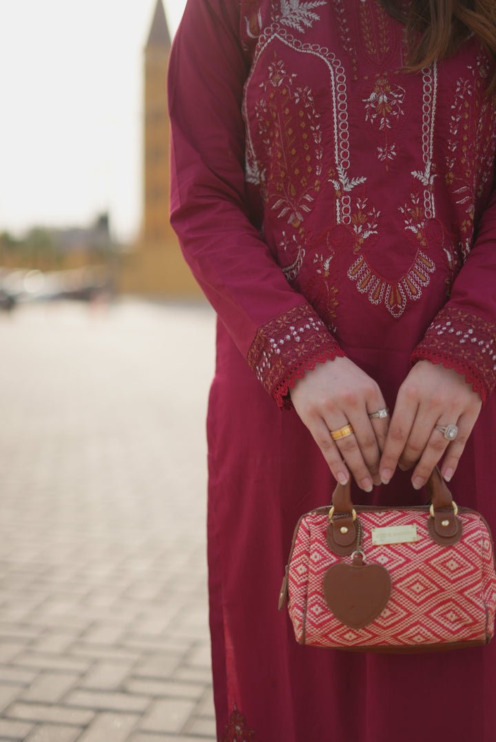 Step into timeless grace with this maroon two-piece ensemble, designed to make a statement with understated luxury. The shirt features a delicately embroidered neckline that adds a touch of refined charm. Complementing the look, an intricately embroidered patch graces the sleeves and trouser, tying the outfit together in perfect harmony. Crafted for both comfort and style, this set is ideal for semi-formal gatherings and festive occasions alike.