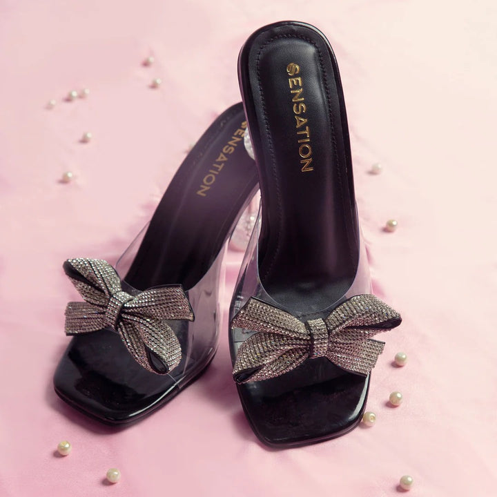 Step into a world of elegance and dazzle with every stride in our 3-inch Heels featuring a Rhinestone bow on a transparent upper and base in synthetic leather.