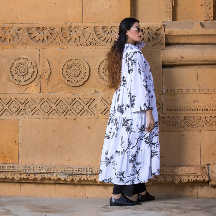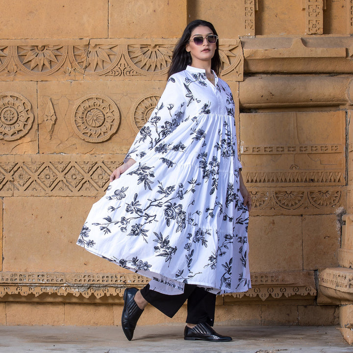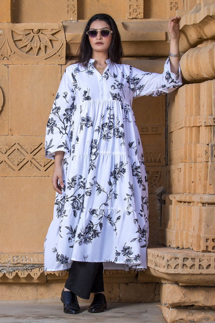 | A gracefully elegant composition is layered over this contemporary dress rendered in a white/black shade. Crafted in an on-trend silhouette with gathers, this flowy dress is enriched with captivating floral pattern. Style this classy dress at fun parties and be the epitome of grace this season. |