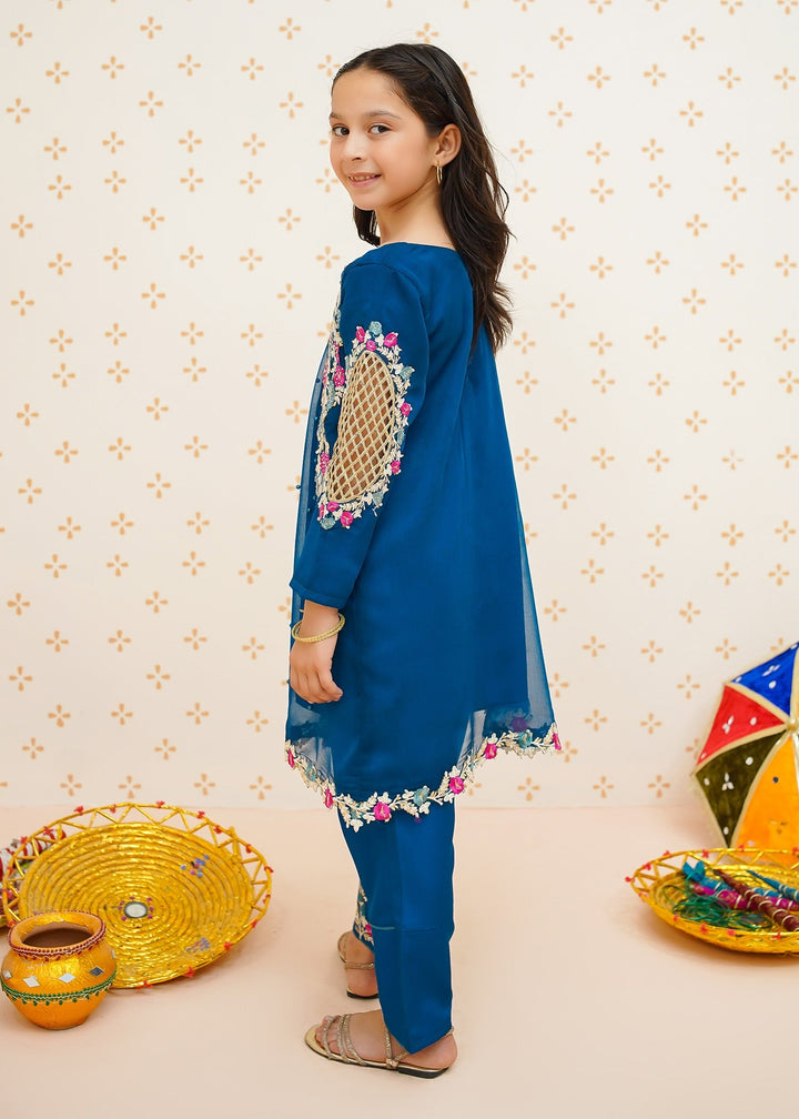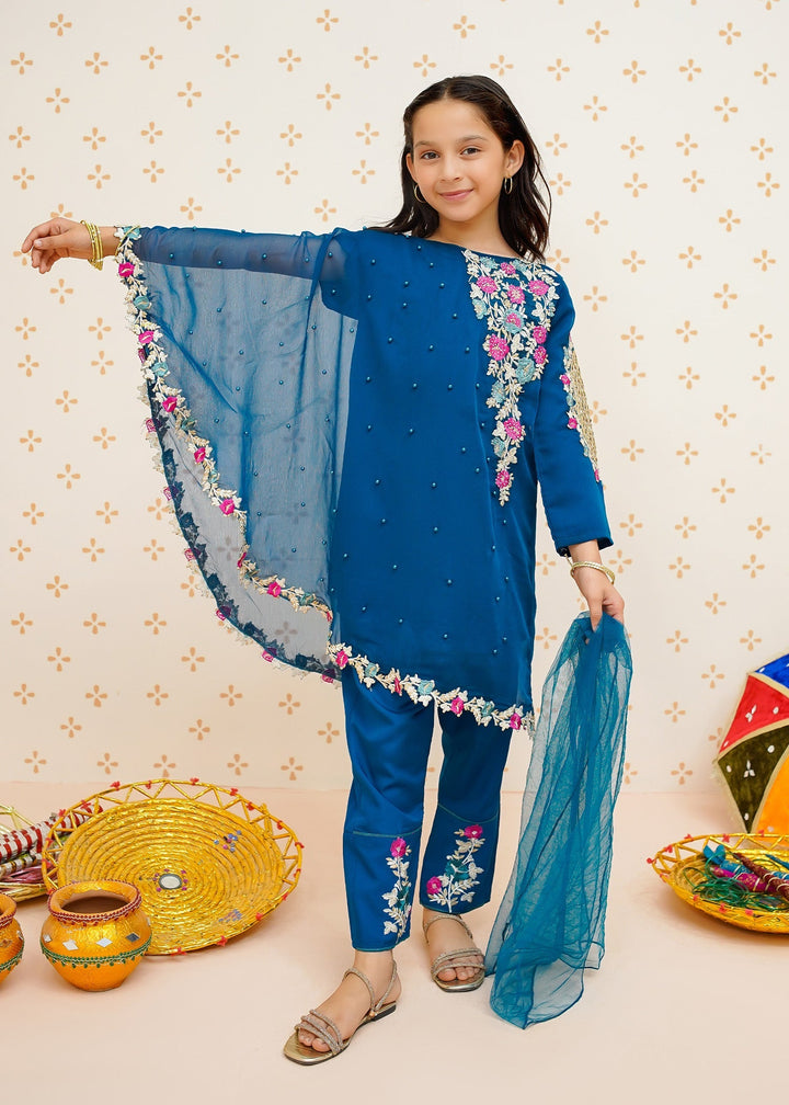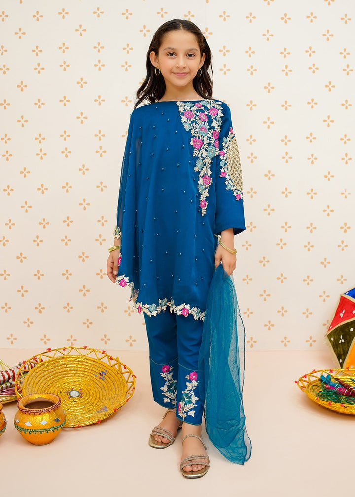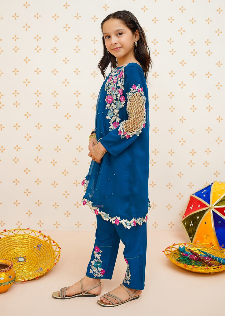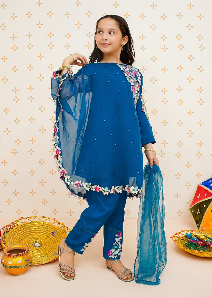 Modest Stitched 3 Piece Formals Kids Collection'2025-Pearl Cape Dress - Blue
