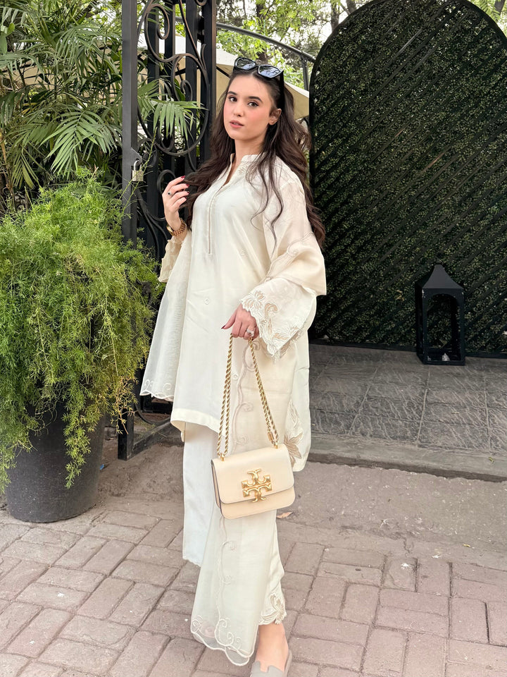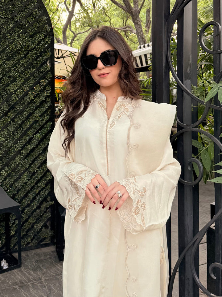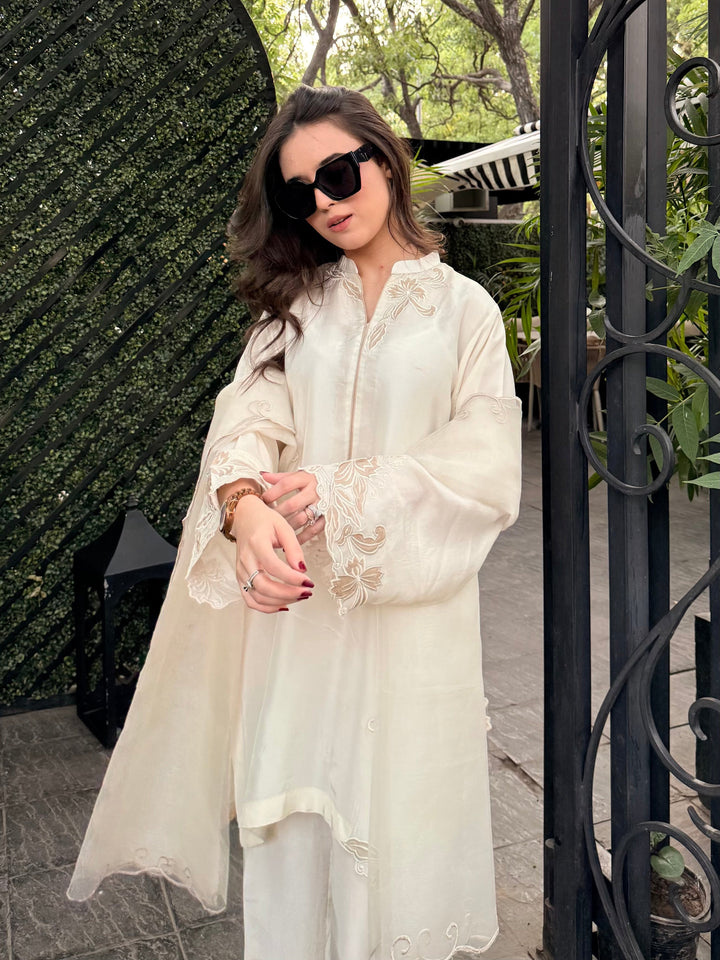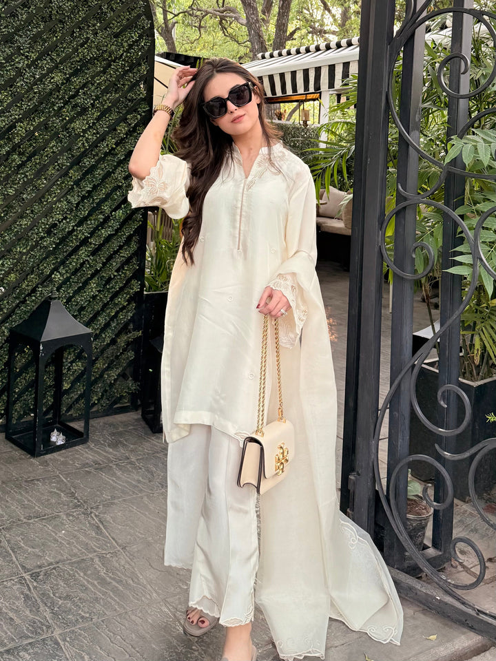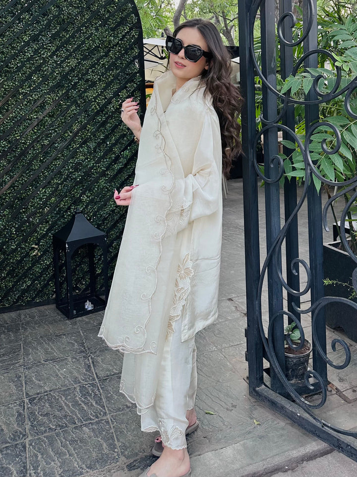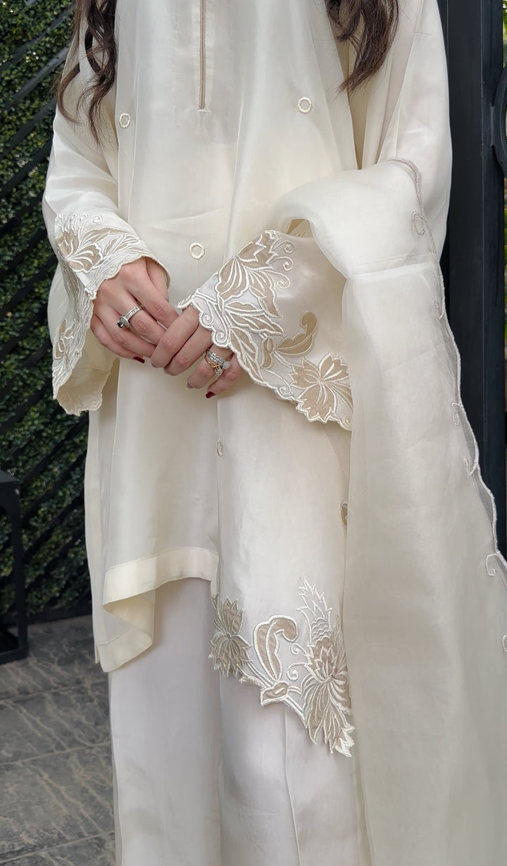 3 pc pearl white outfit shirt and trouser Made on Ramen silk paired with 2.75m pure organza dupatta
