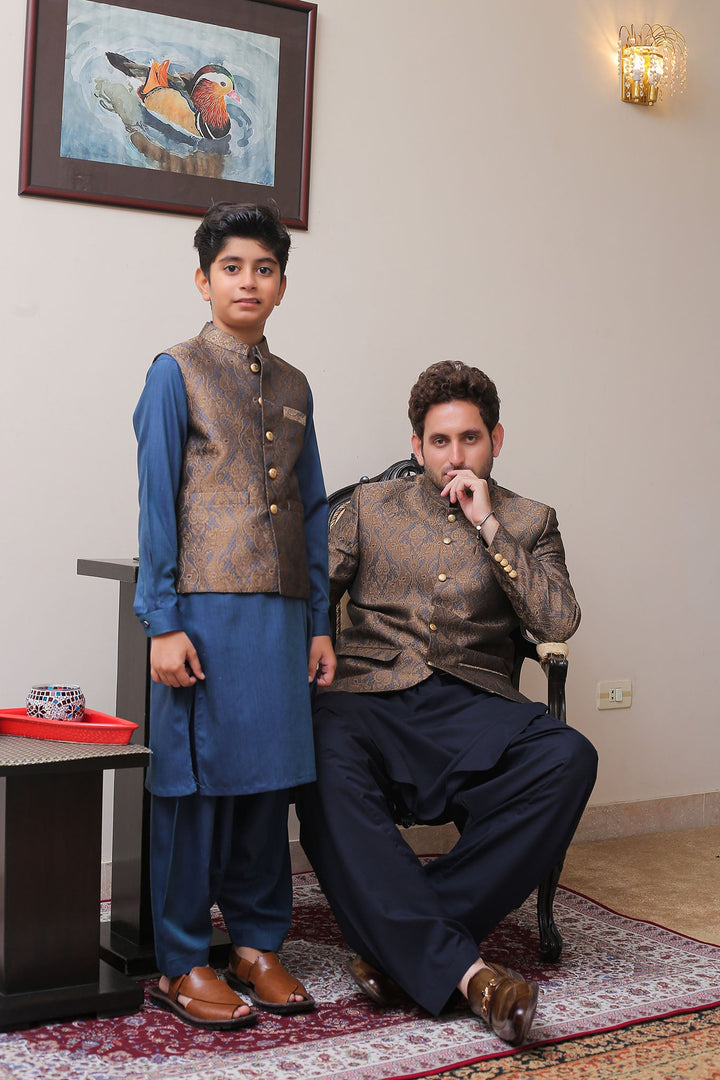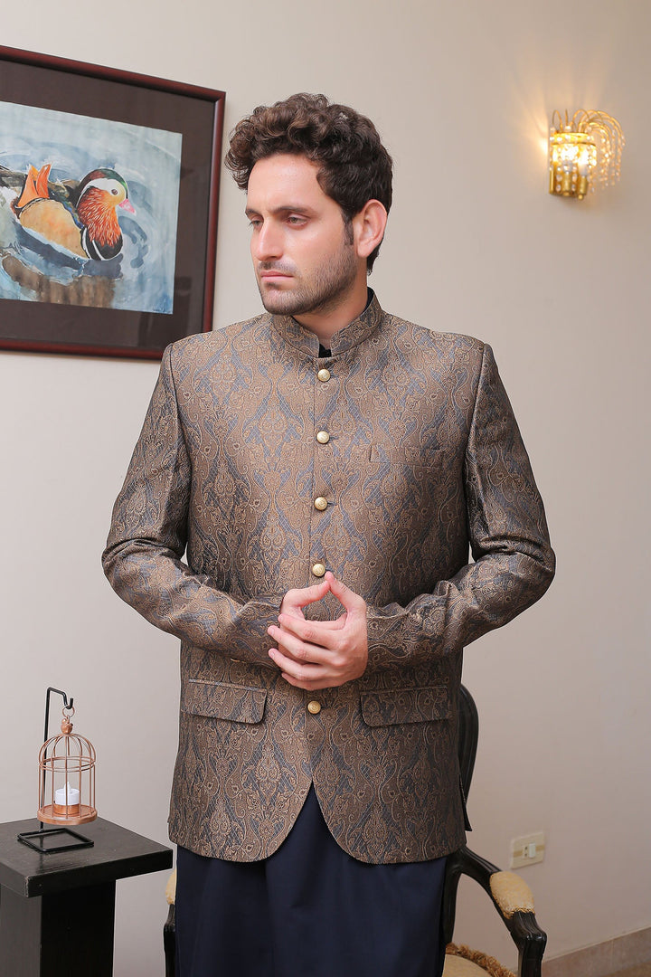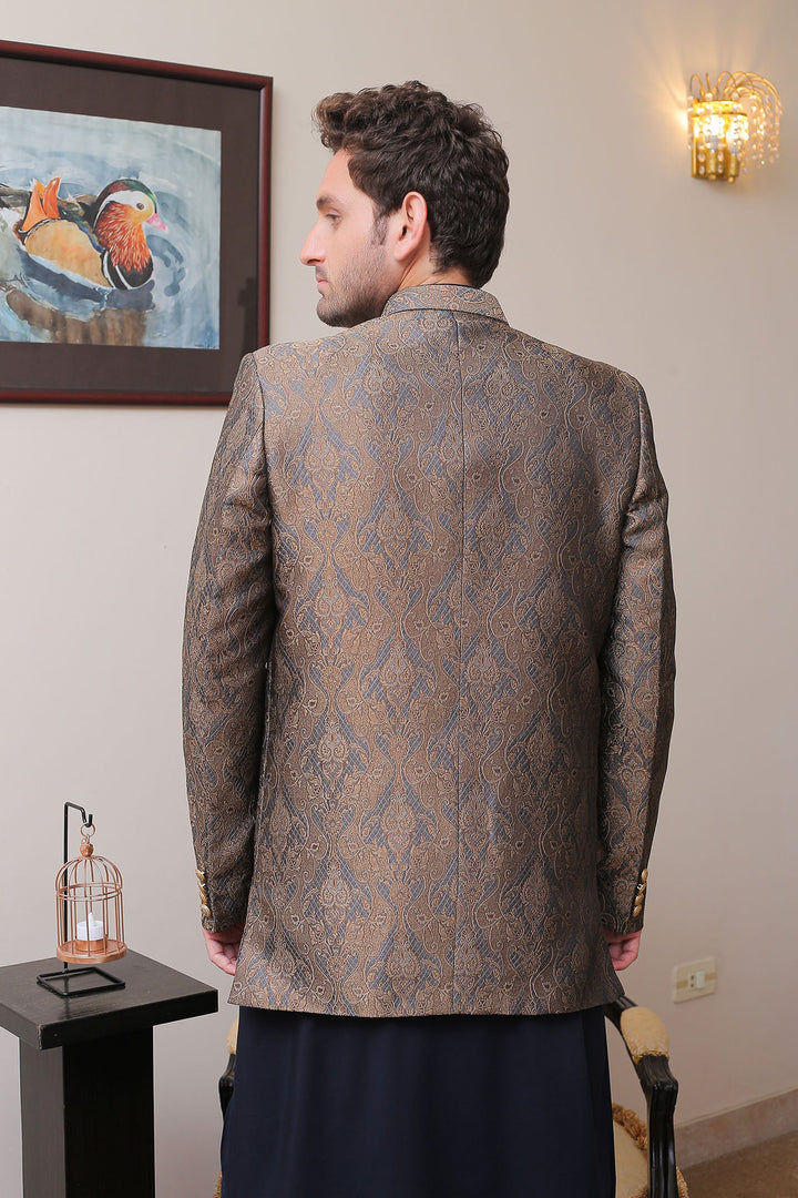 Formal Style Prince Coat for Men , Jamawar Silk Fabric , With Rich Geomatric Weaved Designed Along With Thread Work and Brown Zari Contrast , Special for Festive And Wedding Wear