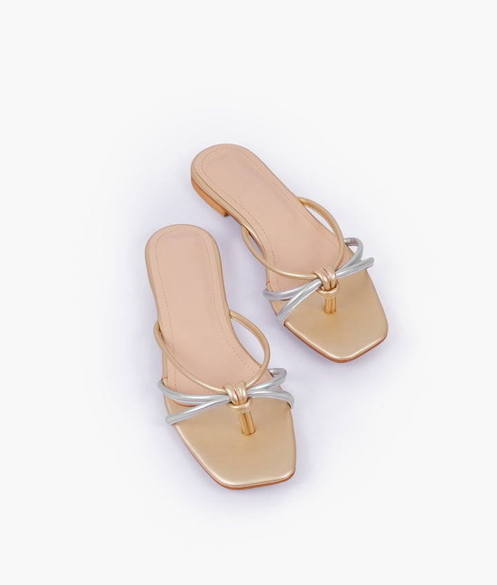 Shine bright with these golden thong sandals an essential for effortless casual elegance Their metallic finish and minimalist design make them a standout choice for adding a touch of glamour to your laidback looks.