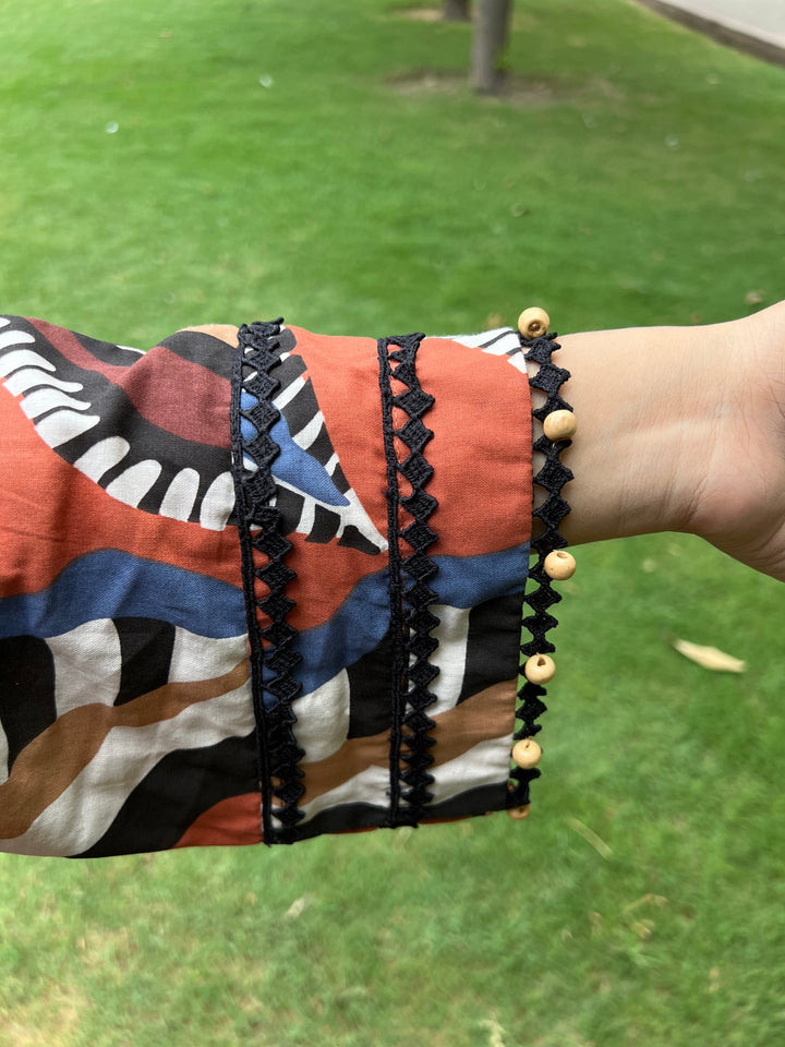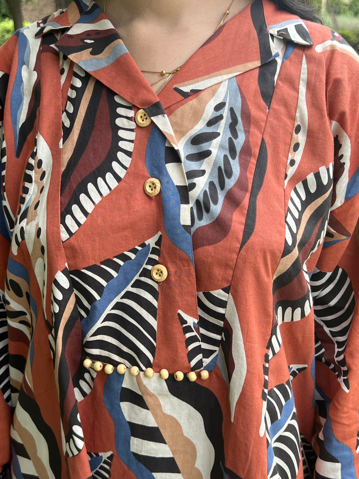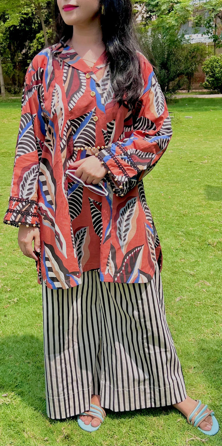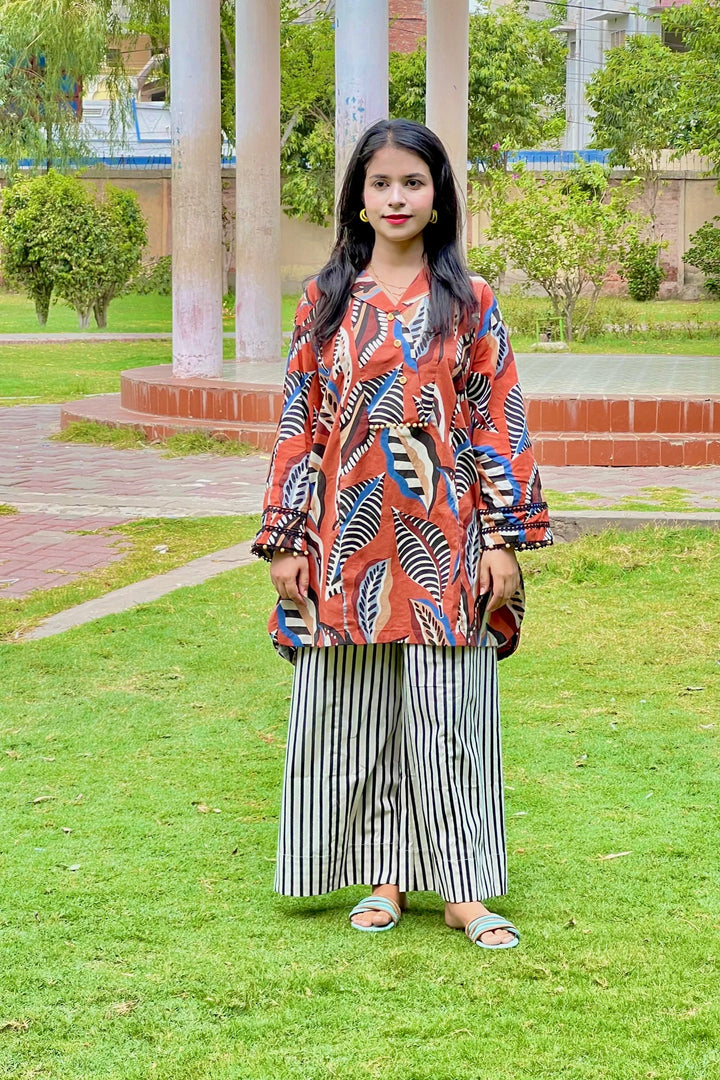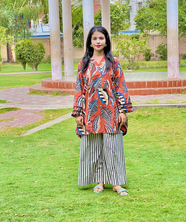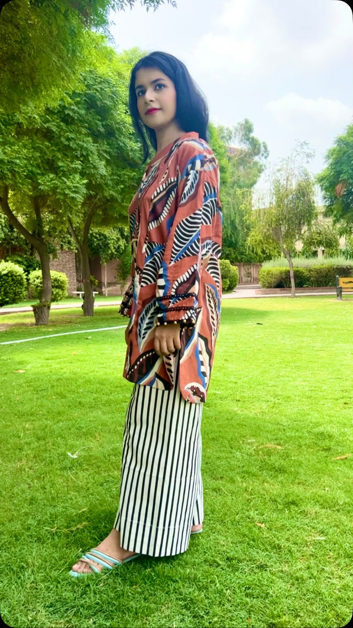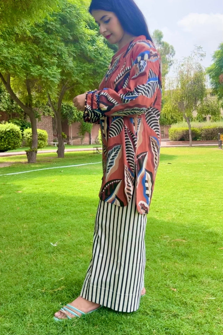 Urban Cut Rust Abstract Cotton 2-Piece Set – Shirt & Striped Trousers