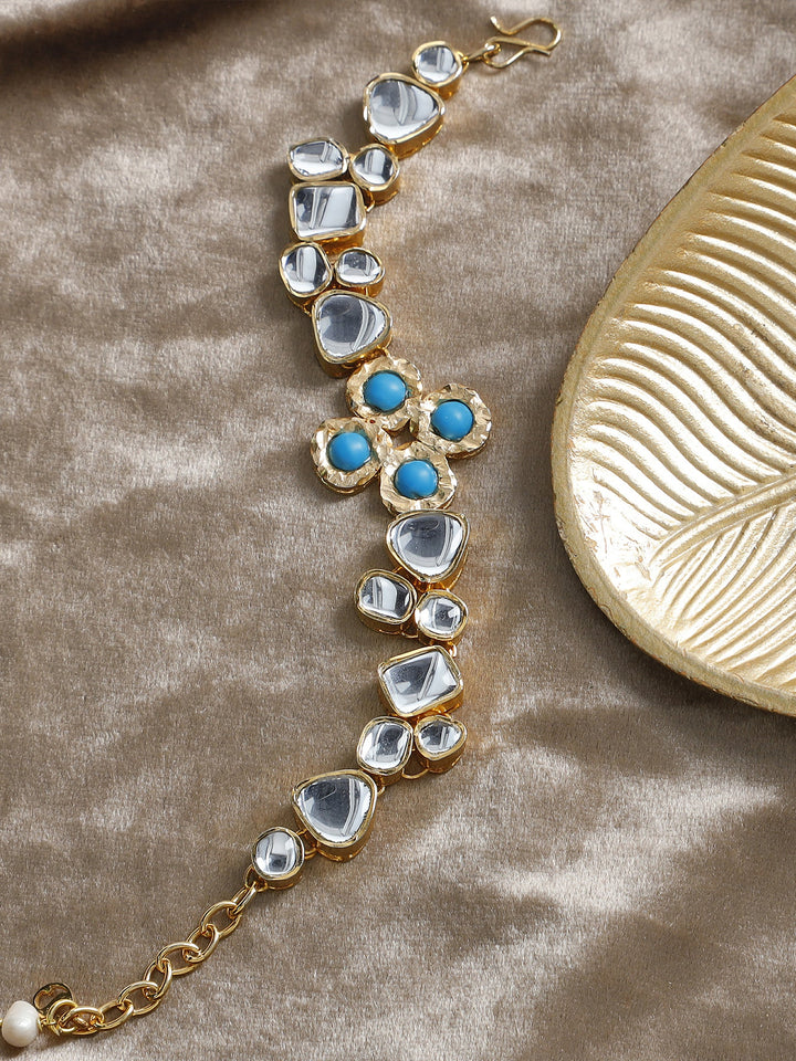 The Safiye chain bracelet features striking blue stones and irregular kundan embellishments, offering a blend of modern elegance and traditional charm. Its unique design makes it a standout accessory for any occasion.