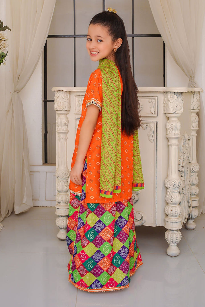 Top: Orange Swiss Lawn Digital Print v-neck and half sleeves kurta along with gota bpatti detailing at front