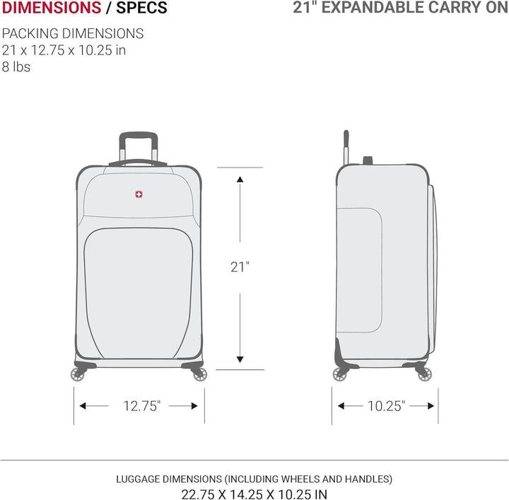 The Swiss Gear Sion Expandable Spinner Luggage Collection features a locking push/pull handle system and four 360-degree spinner wheels for superior mobility. Made of durable, scuff-resistant polyester fabric, its interior is fully lined and features adjustable luggage tie-down straps, a removable zippered wet bag, a large mesh lid pocket, and a packing pocket for holding small items and accessories. Other features include two front panel pockets, a built-in ID tag, and a padded top grab handle.