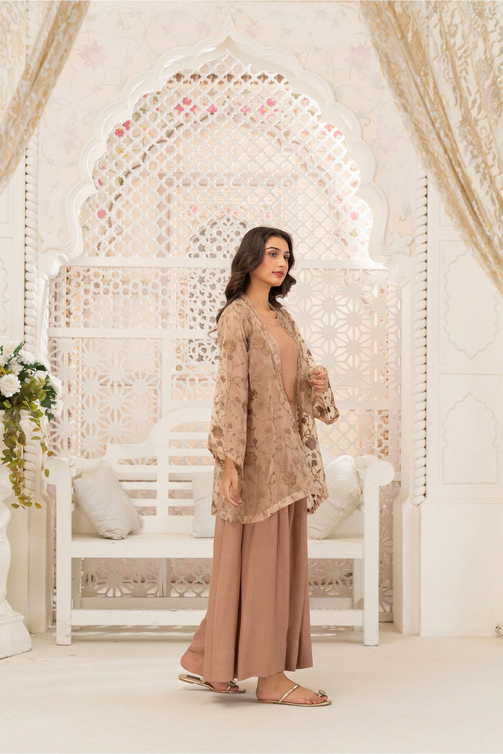 Additional Description: Elegant organza embroidered gown with intricate handwork lace, featuring a sleeveless inner and a high-waisted pleated pant with a graceful flare—timeless beauty redefined!