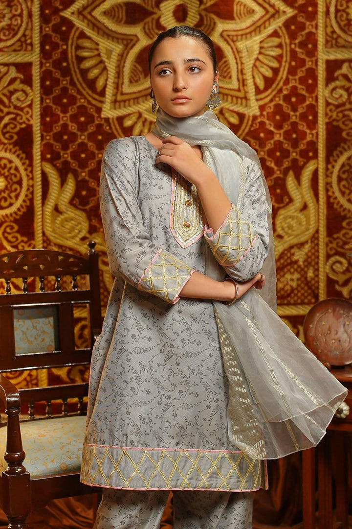 Bottom: Grey Cotton Silk Dhaka Pants with Screen Print & Gotta Work