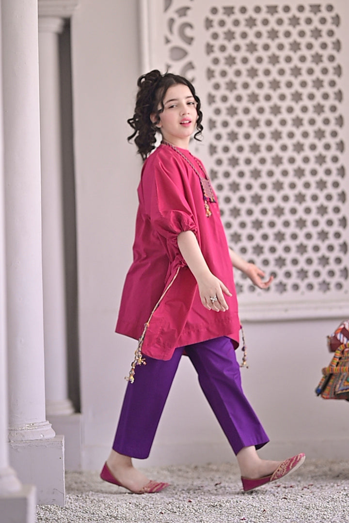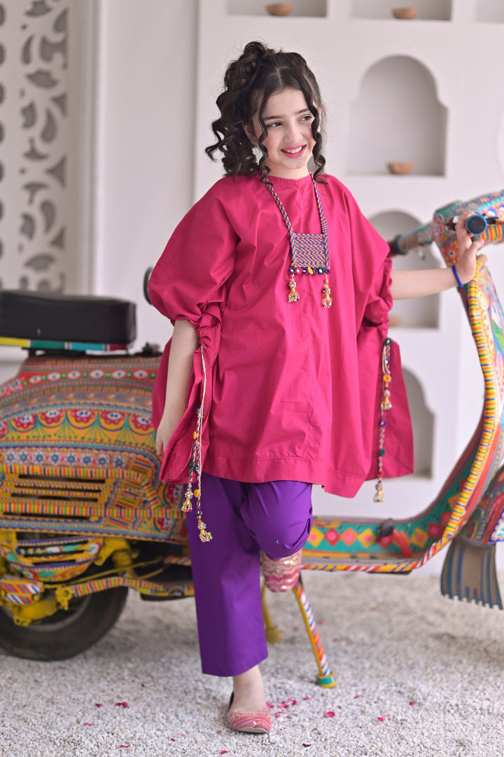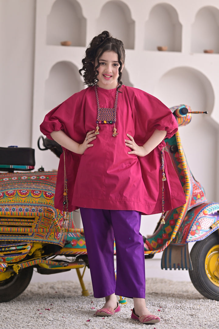 2 piece dress having Pink Kaftan Embellished with Tassels on arms paired with mirror and tassels necklace. The trouser is in purple color